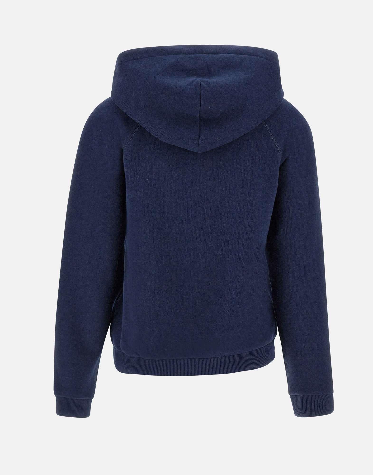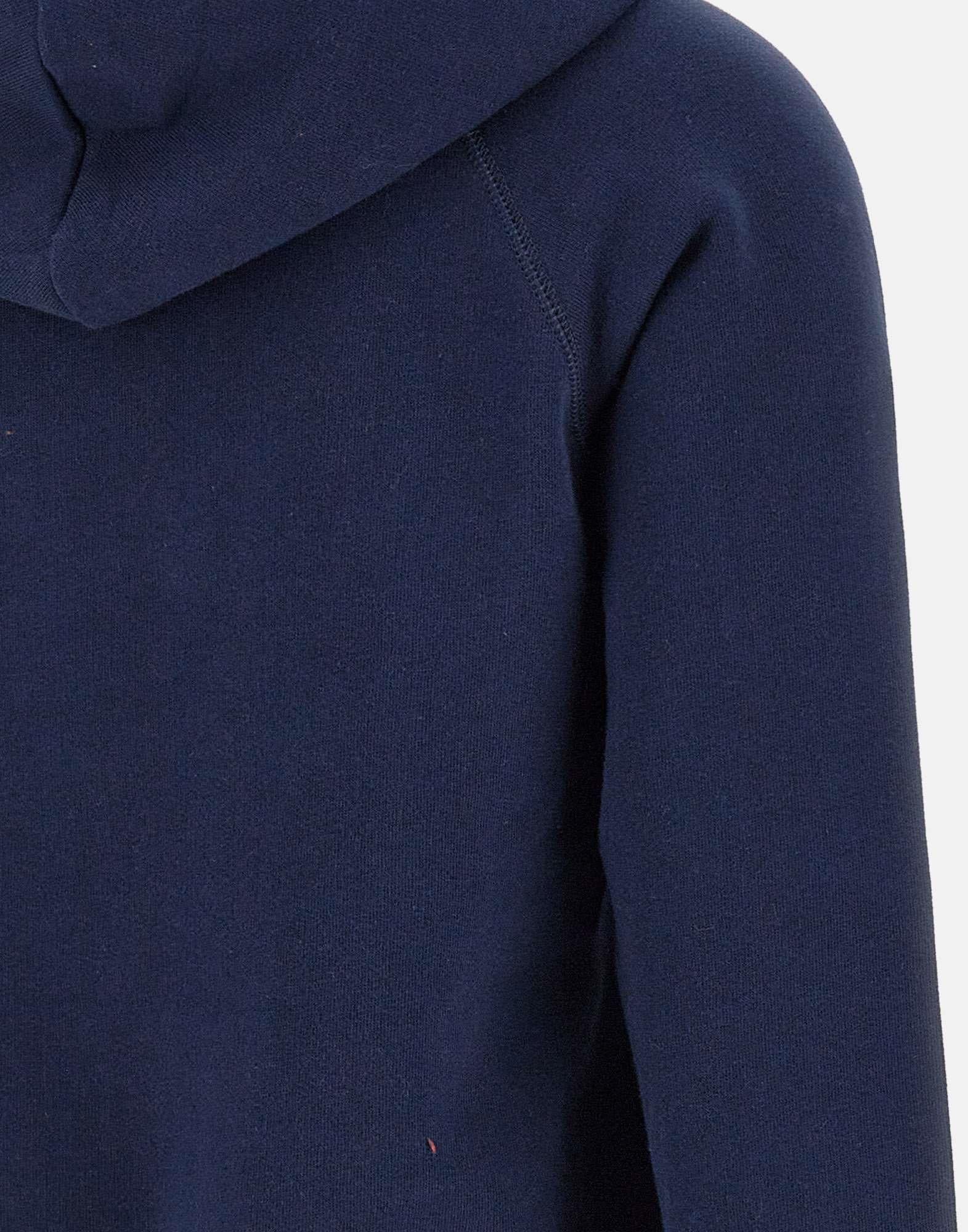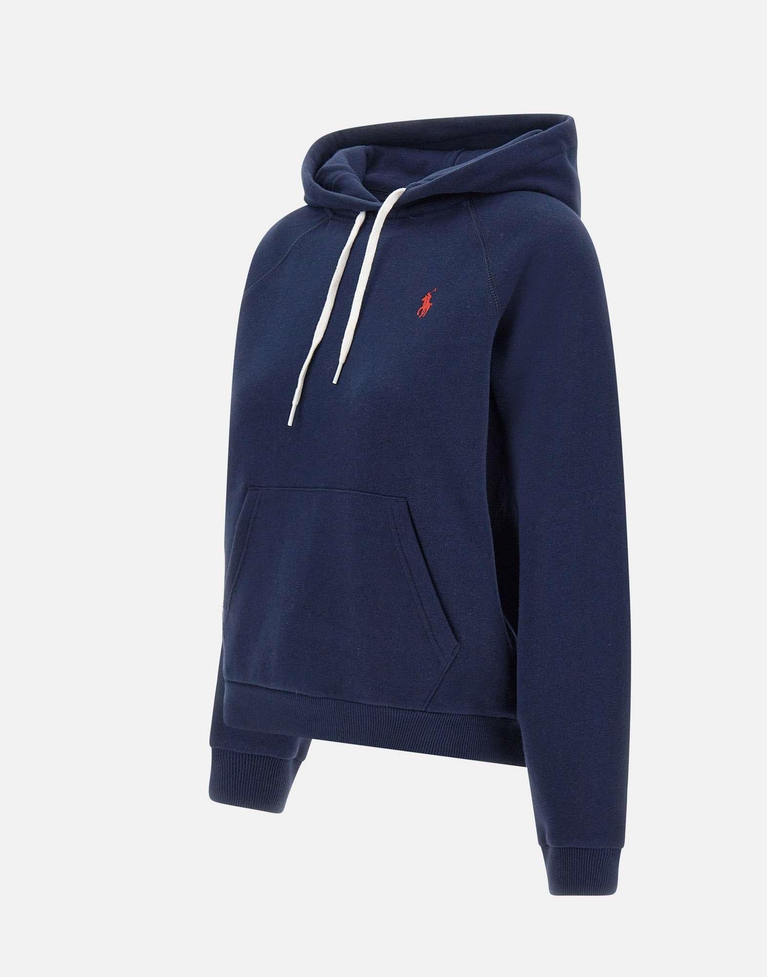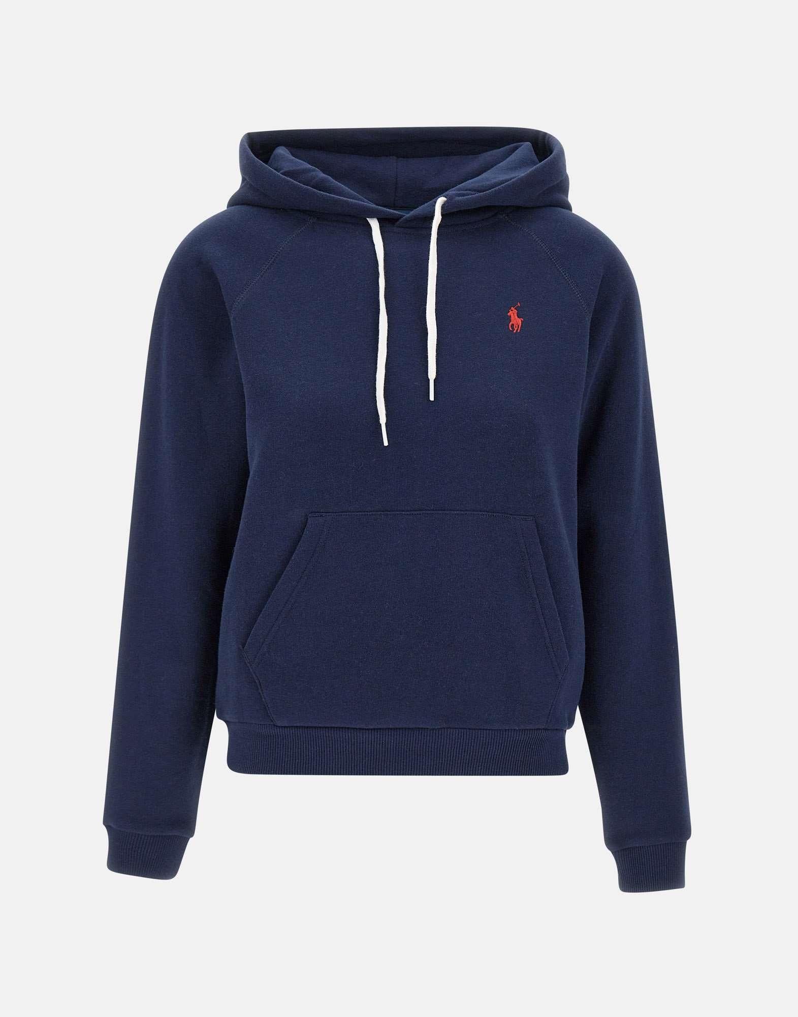 Polo Ralph Lauren women's "Classics" cotton blend sweatshirt, navy blue, long sleeves, hood with contrasting color drawstring, kangaroo pocket, embroidered logo on chest, ribbed hems, fleece interior, regular fit.