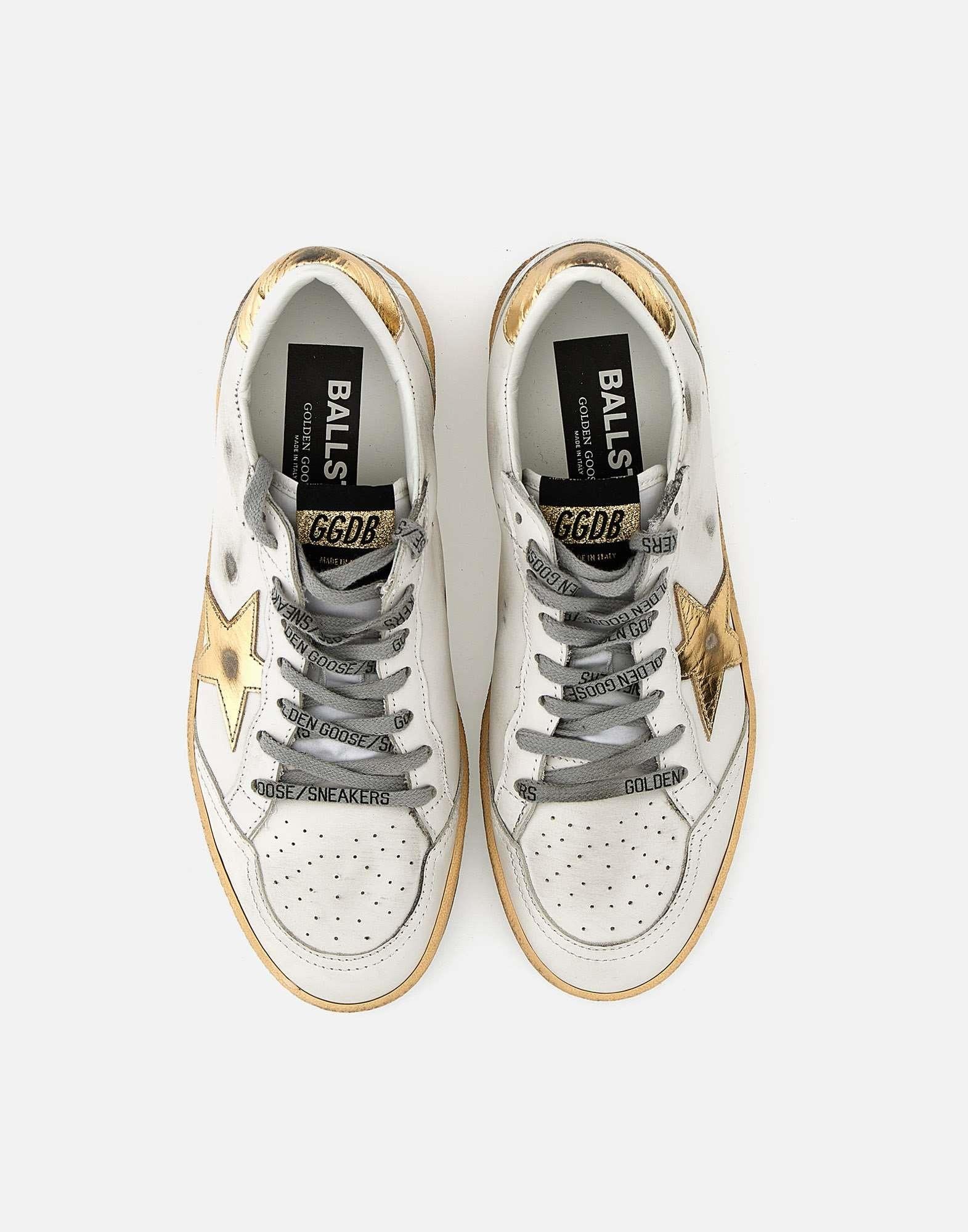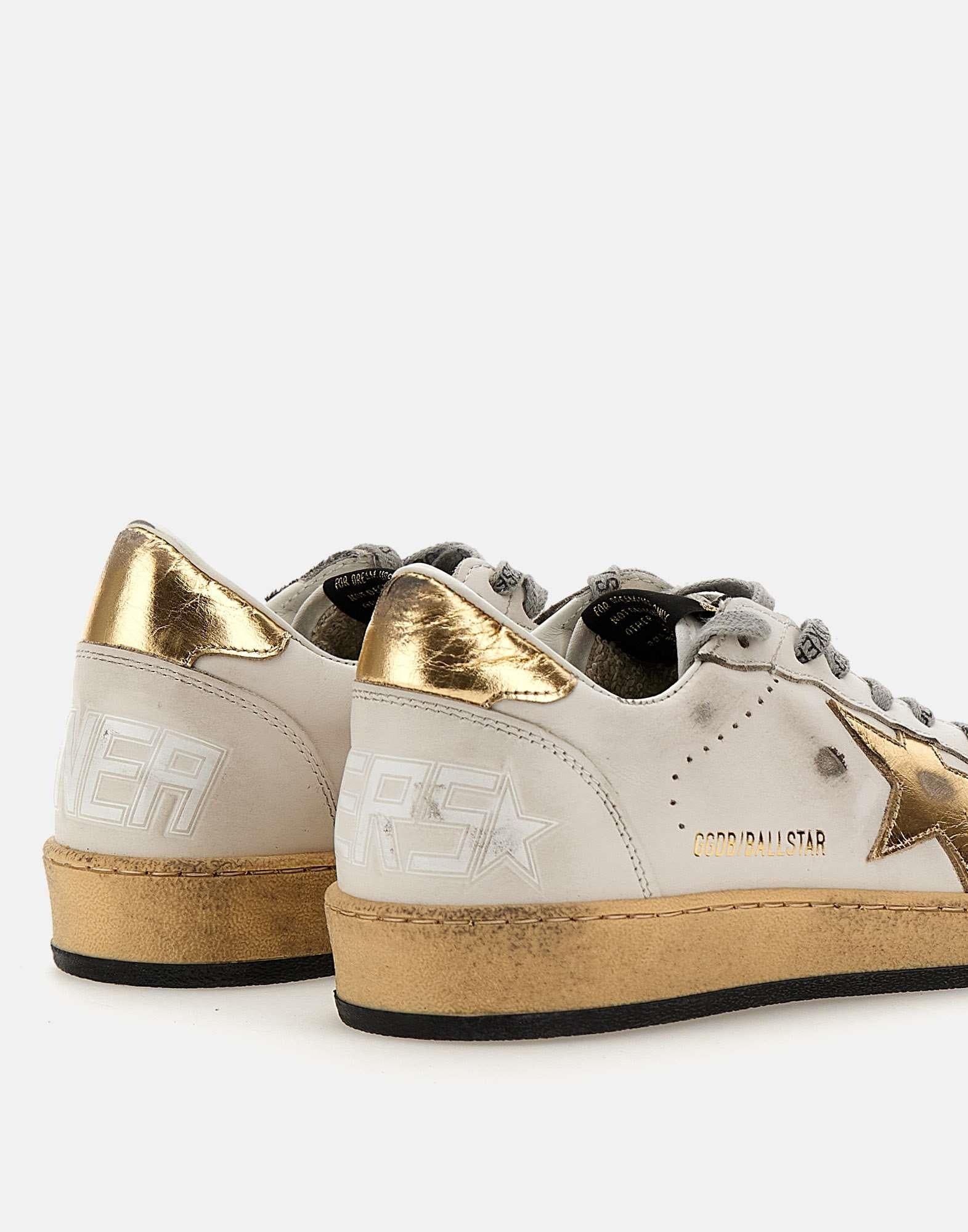 Golden Goose "Ball Star" women's leather sneakers, off-white with laminated gold details, used effect, grey logoed laces, holes for breathability, embossed logo on heel, logo on tongue, mini gold logo, leather lining, sole rubber 3cm high. Made in Italy.