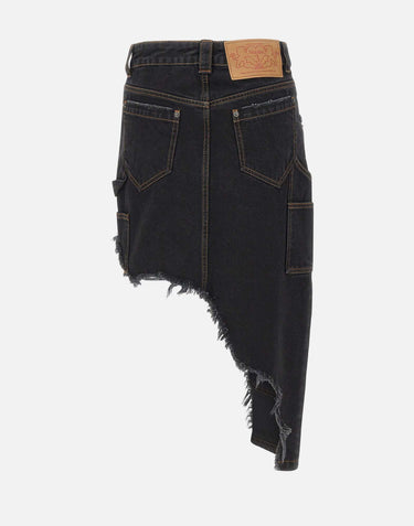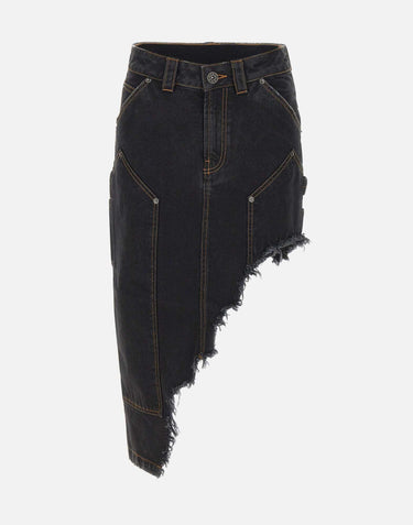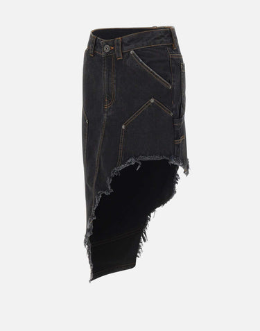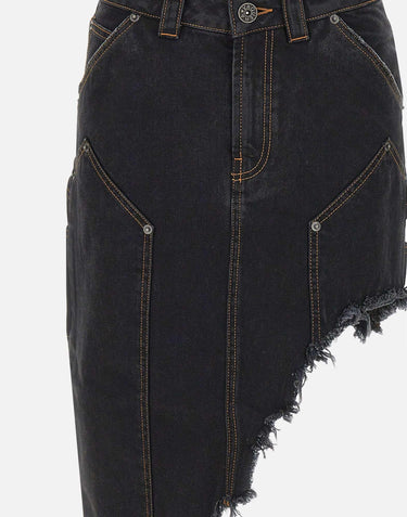 Vaquera womens skirt in navy blue denim, offering a bold, contemporary twist on a wardrobe classic. The design features contrast stitching in mustard yellow, adding structure and a graphic touch. A raw, asymmetrical hem with a worn-in effect enhances its edgy street aesthetic. Complete with two side pockets and two back pockets, and finished with a front button and zip closure. A rebellious take on the denim skirt, ideal for unconventional urban styling.