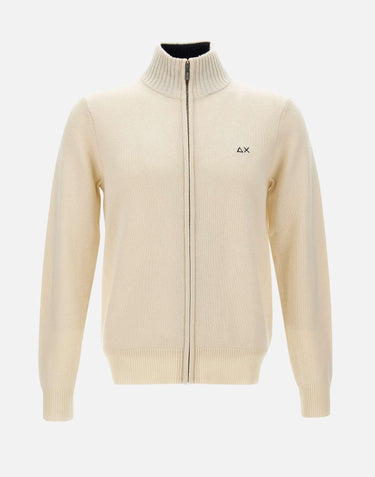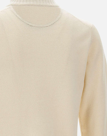 Men's sweater in a premium wool and cashmere blend, cream white, featuring a high neck, ribbed cuffs, and hem. The full zip front adds practicality and a sporty touch to this warm and elegant piece, ideal for the cold season.