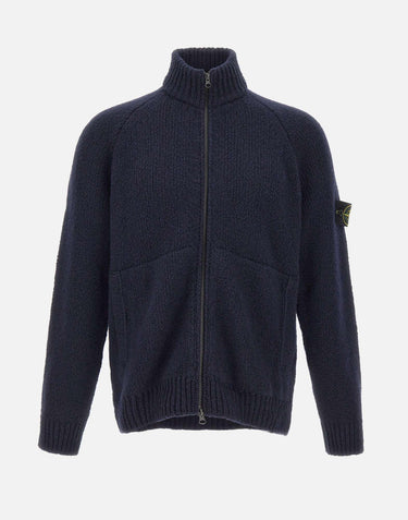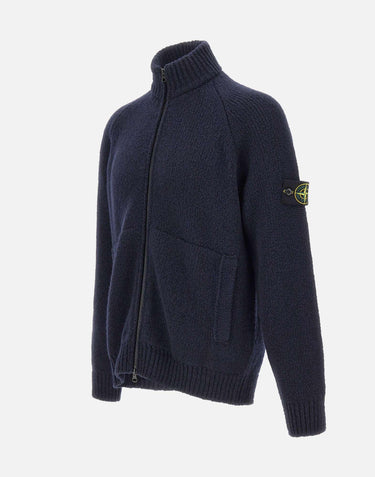 Mens Stone Island sweater in mouliné wool and nylon blend, presented in blue. Crafted in 3-gauge plain knit, it features ribbed crew neck, raglan sleeves, and vertical pockets. Finished with ribbed cuffs and hem, two-way zip closure, and the iconic Stone Island badge on the left sleeve. Loose fit.