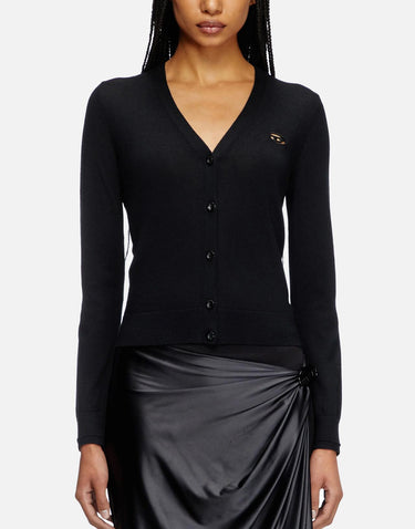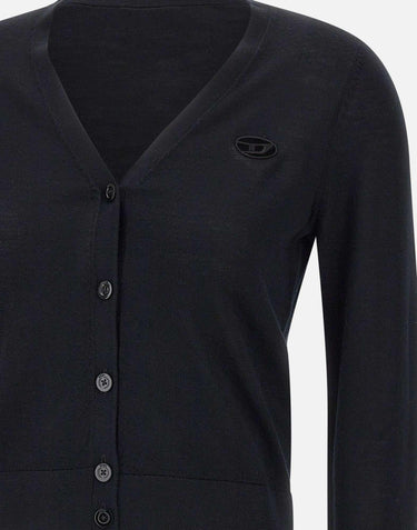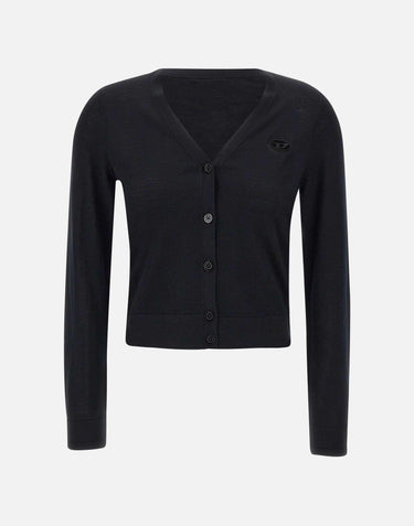 Diesel women's M-alima fine wool knit cardigan, black, long sleeves, V-neck, ribbed edges, tone-on-tone logo button closure, oval D logo with cut-out detail on chest, regular fit
