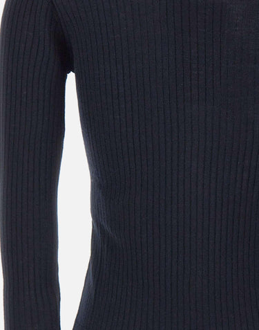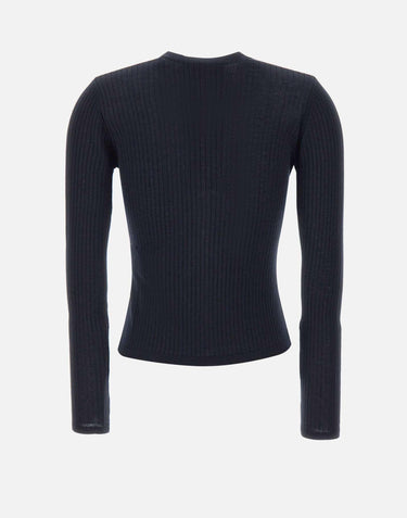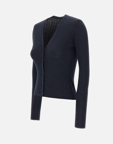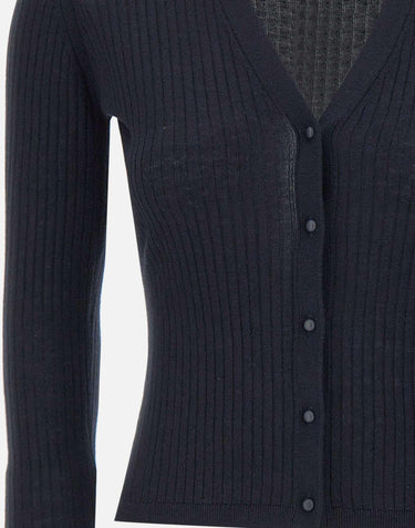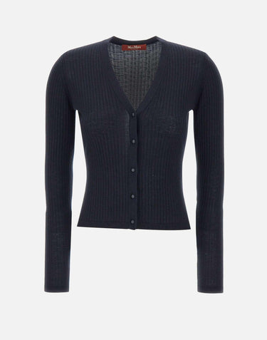 Max Mara Studio "Potus" cardigan, blue, silk and wool, ribbed weave, long sleeves, fastening with matching buttons, V-neck, slim fit