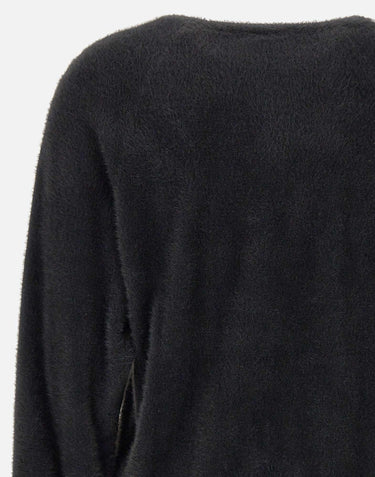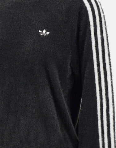 Holiday sweater Adidas, black color, chenille, long sleeves, crew neck, iconic side bands and contrasting color Clover logo, relaxed fit