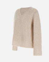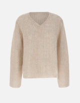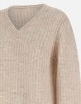 Maglia Hemisphere donna, color perla, realizzata in un pregiato mix di cotone e cashmere. Caratterizzata da scollo a V, maniche lunghe e lavorazione ad intreccio operata che aggiunge un tocco sofisticato al design. I polsini ampi e il taglio dritto completano il capo, offrendo comfort e vestibilità relaxed.