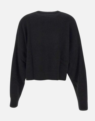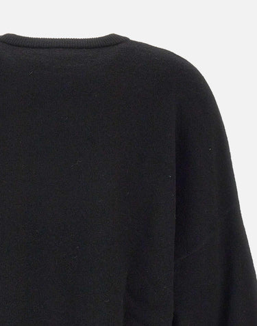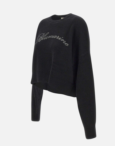 Blumarine wool sweater, black, long sleeves, crew neck, raglan shoulders, maxi logo with rhinestones on front, side slits at hem, ribbed edges, oversize fit