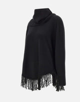 Elena Mirò sweater in a fine blend of wool, cashmere, and viscose, black color, with a warm and comfortable design. It features long sleeves, a round neck, and ribbed edges. The fringe detail at the hem adds movement and a contemporary touch. Regular fit, perfect for casual-chic seasonal looks. Neck warmer included.