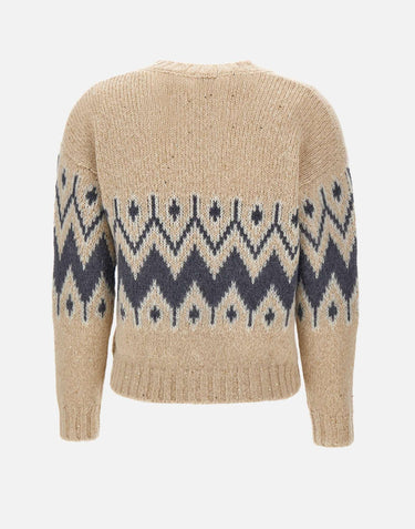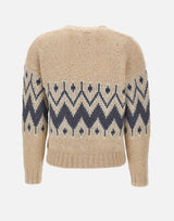 Eleventy women's wool and alpaca blend sweater, beige with contrasting geometric decorations, long sleeves, round neckline, ribbed edges, micro sequins all over, raglan shoulders, relaxed fit, made in Italy