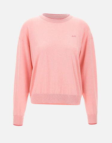 Sun68 women's made of wool and cotton sweater, pink colour and contrasting colour profiles, long sleeves, crew neck, logo on chest, regular fit.