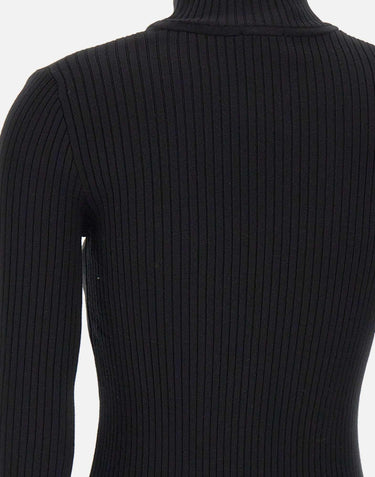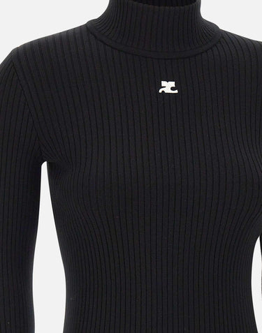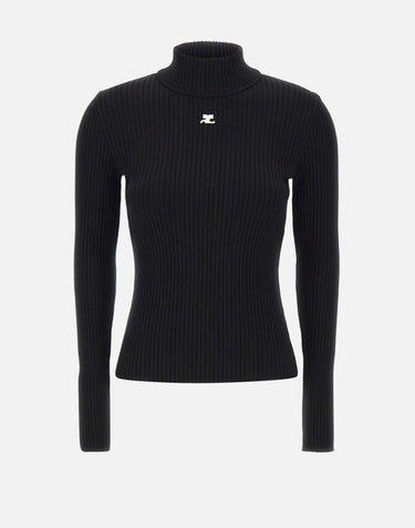 Womens Courrèges "Reedition Rib Knit" top in black, a timeless piece with a clean, modern silhouette. Crafted in ribbed knit with a slim fit, it gently hugs the body for a flattering, elegant look. The high ribbed neckline adds structure and versatility, perfect for layering or solo wear. A contrasting white Courrèges logo on the chest offers a bold, signature touch. A refined essential with a sleek, contemporary edge.