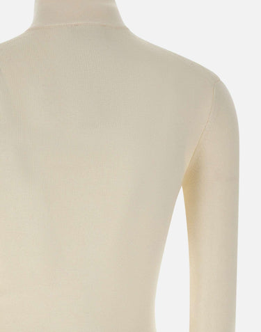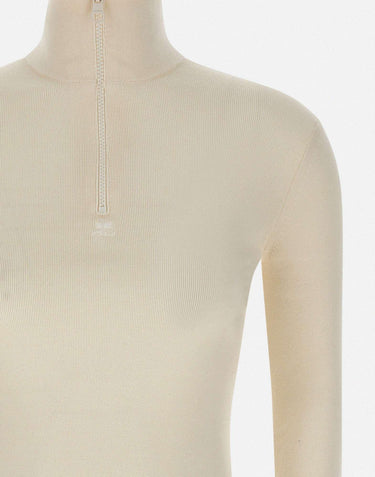 Women's Courrèges "Zipped Mockneck" pullover in pure wool, in an elegant optic white tone. Featuring a half-zip front, high stand-up collar, and tonal AC logo embroidery on the chest. Long sleeves and a slim fit silhouette provide warmth and a refined, minimalist aesthetic ideal for transitional and winter layering.