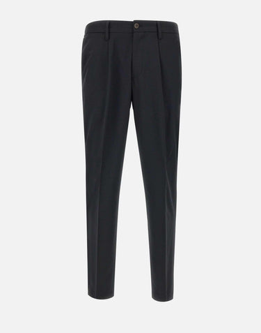 Men's Devore "DV15 Leisure Chino" made of stretch wool blend fabric trousers, black, darts on front, partially elasticated waist with belt loops, side welt pockets, back pockets with flaps, zip and button fastening, straight leg with 17cm hem, made in Italy, regular fit.