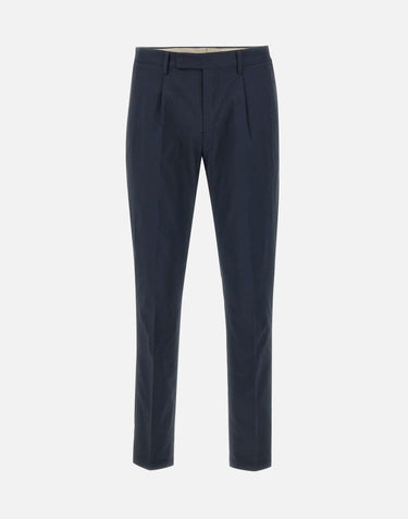 Devore Incipit men's "Dvr33" trousers, blue, stretch cotton blend, Royal batavia tech luxurious fabric to touch and wear, button and zip fly, single dart, straight leg with 17cm hem, belt loops, French pockets, back pockets with snap buttons, slim fit, made in Italy