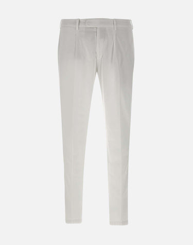 Men's Devore Incipit "DVR33" Pima cotton and stretch silk trousers, white, extra comfort fabric to touch and wear, darts on front, regular waist with belt loops, side welt pockets, back pockets with snap button, zip and button fastening, straight leg with 17cm hem, made in Italy, slim fit.