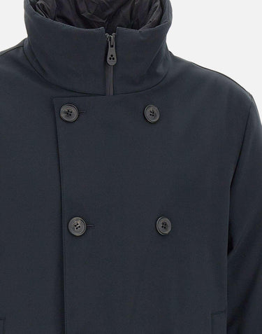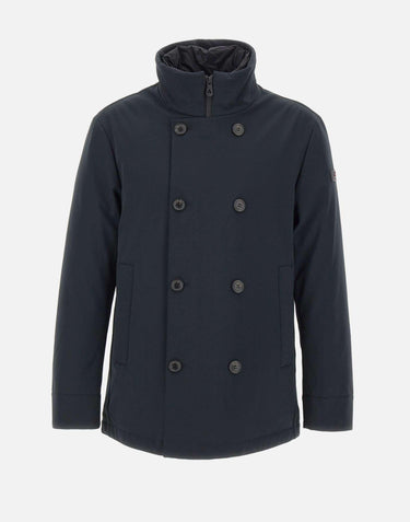 Men's Peuterey "Militao TJ 01" jacket in recycled polyester stretch fabric with a clean, matte twill structure. Blue color. Double-breasted button closure, removable inner zip vest, and certified natural down padding (650 Fill Power) for excellent thermal insulation. Water-repellent and windproof treatment for protection and comfort. Side pockets with invisible zips. Regular fit for a sophisticated and versatile look. Cooler days +10°-5°