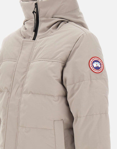 Canada Goose's "MacMillan" parka in stone grey features a modern, functional design. Crafted from durable technical fabric, it offers optimal thermal protection in temperatures ranging from -10°C to -20°C. The down-filled snorkel hood is adjustable and features a removable zipper for customizable trims. The chin guard is lined with tricot fabric for extra comfort, while the inner lining includes practical backpack straps for hands-free carrying. The two-way zip front closure is protected by a snap-button flap, while CORDURA®-reinforced sleeves and ribbed cuffs insulate against the cold. Fleece-lined external pockets with zippers and internal pockets for added convenience. Filled with 625 fill power down. Hip-length with a slightly longer back, regular fit.