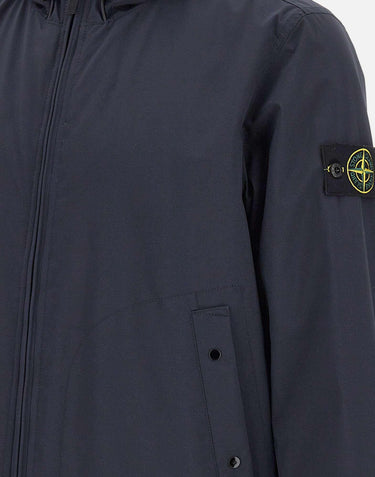 Stone Island "Soft Shell-R e.dye® Technology" jacket in blue, made from 3-layer fabric with 8000 mm water column. The outer face is 100% recycled polyester stretch canvas, dyed with e.dye® Waterless Color System for reduced water and energy use. Breathable, waterproof and windproof membrane with PrimaLoft® Gold P.U.R.E. insulation provides warmth without bulk. Features hood with visor and drawstring integrated into the collar, snap-button welt pockets, internal pocket, iconic Stone Island badge on the sleeve, adjustable cuffs, drawstring hem, and concealed two-way zip closure. Regular fit.