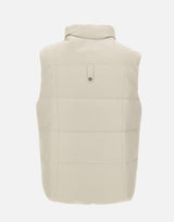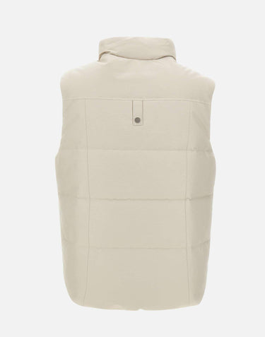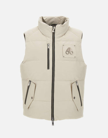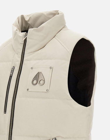 Moose Knuckles "Westmount Original 2Tone" vest in alabaster, designed as an everyday winter essential. Protection level 2: shields against rain, snow, and wind while remaining breathable. Crafted from GRS- and RDS-certified materials blend cotton, featuring a color-block design, down-filled collar, two-way front zip, three zippered pockets, and two snap-button pockets. Finished with a signature metal logo. Regular fit. Thermal Expericence da 0°F a 14°F