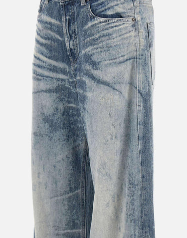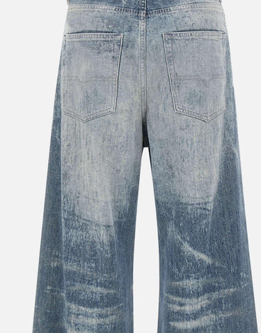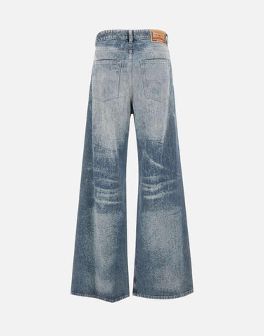 Diesel "D-Sire FSH" women's jeans in textured denim with all-over distressed details. Low-rise waist with belt loops, five-pocket design, concealed button fly, and logo patch at back. Wide-leg cut with 30 cm hem and 83 cm inseam size 26. Relaxed fit for a modern streetwear vibe.