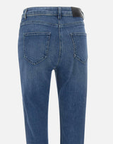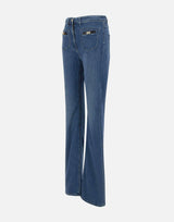 lisabetta Franchi "Urban" jeans in dark-wash blue denim, crafted from a cotton and lyocell blend. Bootcut style with mid-rise waist and flared hem (24 cm). Contrasting trims with gold-tone logo on front pockets, patch pockets and logo label at back. Slim fit for an elongating silhouette.