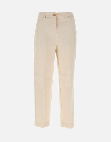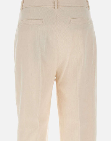 Boss "Tecarino" trousers in cotton-blend corduroy, in a refined off-white shade. Cropped straight-leg design with regular waist and belt loops. Featuring button and zip closure, front pleats, slanted side pockets and welt back pockets. 19 cm hem for a clean, versatile look. Regular fit, ideal for smart-casual outfits.