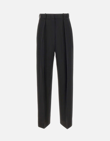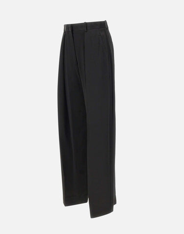 Victoria Beckham "Satin tailored trousers" black viscose-blend satin with refined tailored cut. Featuring central crease, zip closure with button and hooks, and wide leg finished with satin trims at the hem. Belt loops, side welt pockets, and back pockets complete the design. Regular fit.