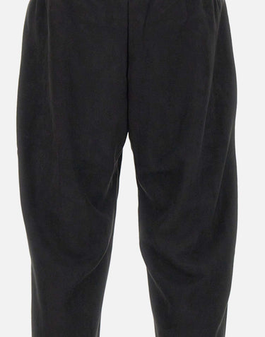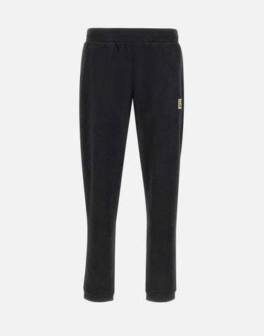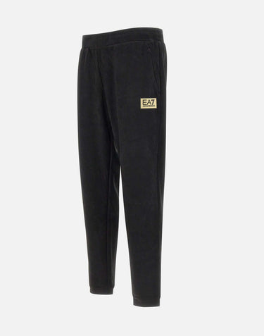 EA7 men's joggers in black, made from soft, peached fabric for superior comfort. They feature an elasticated waistband, side zip pockets, and a 17 cm cuff. A gold-tone woven logo label adds an elegant detail. Slim fit for a modern, streamlined look.