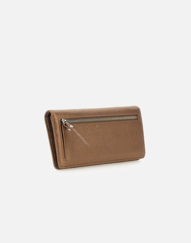 Hammered leather "Wallets grain" Gianni Chiarini, bronze color, practical and elegant and fashionable. Snap button closure and multiple card slots, banknote compartment, zip pocket on back, embossed logo on front. Dimensions: 19x10x2 cm.