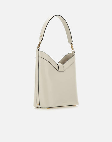 Elisabetta Franchi vegan leather shoulder bag, butter color, smooth finish, removable top handle, gold electroplating, bucket design, single compartment with inside pocket and two card slots, feet at bottom, band and button closure, enameled double C logo, 25cm length, 31cm height, 12cm depth.