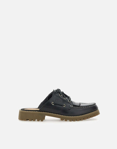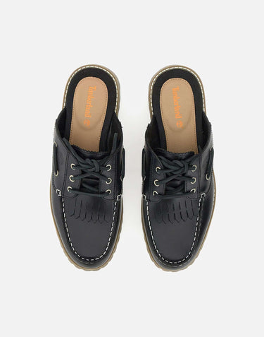 Timberland "Noreen" women's mule Premium leather sandals, black colour, ReBOTL fabric lining containing 50% recycled PET plastic, OrthoLite® insole, without laces, logoed insole, side embossed logo, contrasting color stitching, preformed rubber sole, 3cm heel.