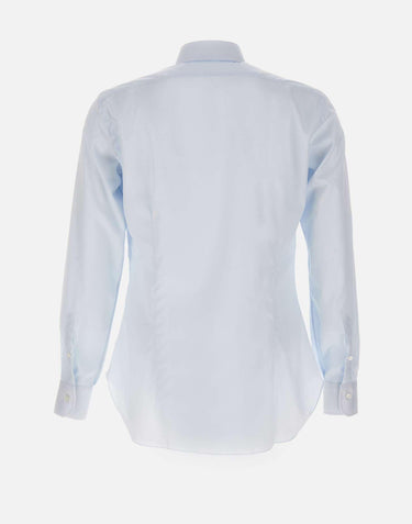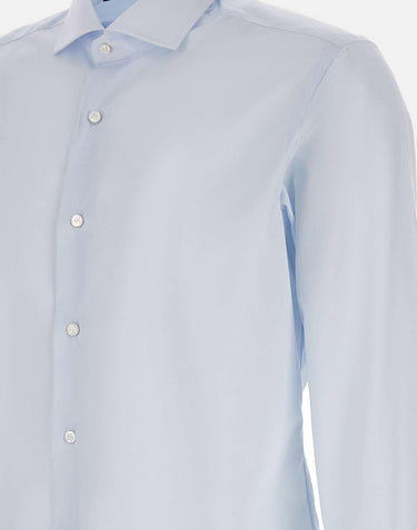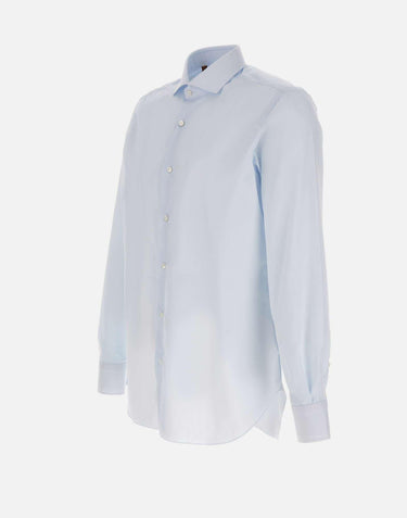 Barba men's cotton poplin shirt, pastel blue, from Journey Collection. Long sleeves, classic collar, cuffs with dual-use buttons, front closure with logoed mother-of-pearl buttons, rounded hem with side vents and mini logo labels. Slim fit. Made in Italy, combining refined tailoring and contemporary style.