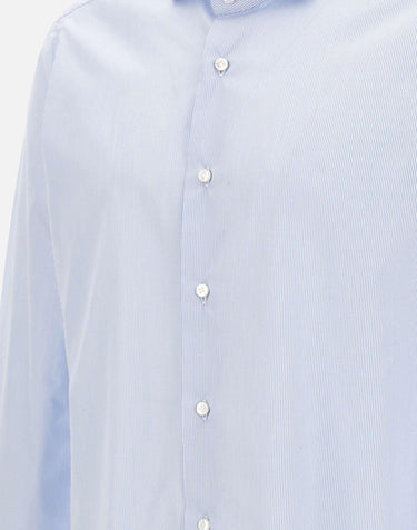 Barba men's cotton shirt, micro-striped pattern shades of white and light blue, Journey Collection, long sleeves, classic collar, cuffs with dual-use buttons, front closure with logoed mother-of-pearl buttons, rounded hem with side vents and mini logo labels. Slim fit. Made in Italy, combining refined tailoring and contemporary style.