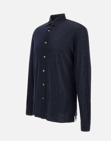 Filippo De Laurentiis men's extrafine royal merino wool shirt, blue colour, ultra comfortable fabric to touch and to wear, long sleeves, classic collar, tone-on-tone button closure, side vents at hem, buttoned cuffs, regular fit. Made in Italy.