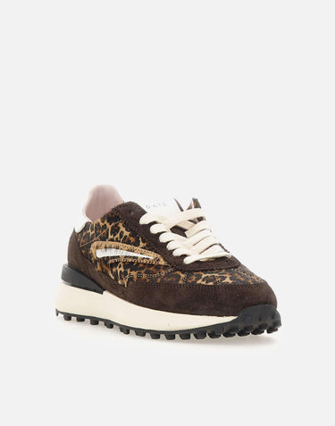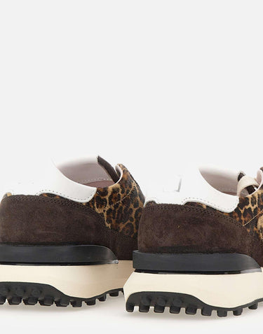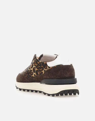 D.A.T.E. women's "Athleta Animalier" sneakers in leopard-print pony skin with brown suede inserts. They feature a patch sewn onto tongue with an embossed D.A.T.E. logo, white cotton laces, a square logo embossed on white leather heel tab, and a white embroidered detail on side. Lining in leather and cotton terry, they feature a 2.5 cm raised insole for superior comfort and a 2-3.5 cm rubber sole. Regular fit.