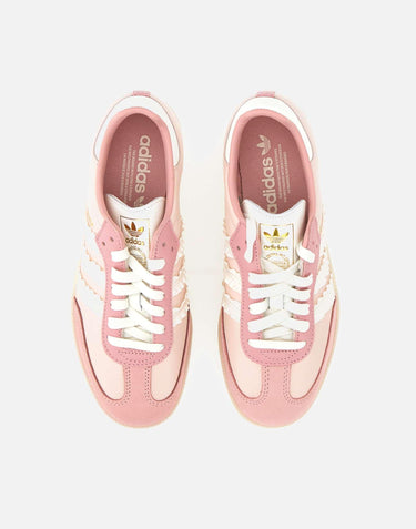 Women’s Adidas "Samba OG" sneakers, offered in a refined pink and white colorway. Crafted in leather with a rounded soft toe, they feature flat laces, iconic side stripes with ruffle effect, and a bold gold logo on the tongue. The grooved rubber sole ensures durability and grip, while the reinforced heel with soft padding provides comfort and support. Replacement laces included. Standard fit. Size UK 6 corresponds to EU 39 1/3. Refer to the Adidas Women’s UK Footwear Size Chart to find your perfect fit.