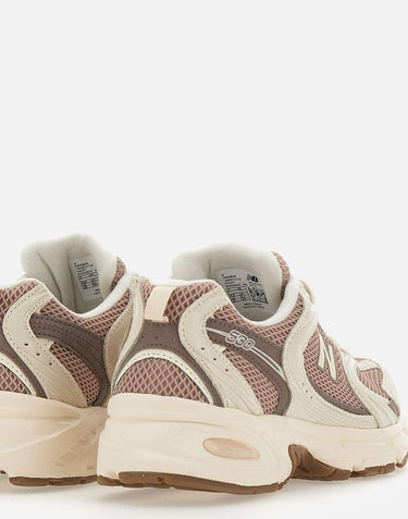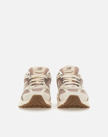 New Balance "U530" sneakers in cream and taupe color, featuring a breathable mesh upper, matching round laces, iconic N logo on side, a grosgrain pull tab on back, and a logo on tongue. These sneakers are inspired by jogging shoes and feature a '90s-inspired design. The 3cm ABZORB outsole absorbs impact thanks to its combination of cushioning and compression resistance. Size US 7 corresponds to 40EU/IT. Convert your size using the NEW BALANCE UNISEX FOOTWEAR USA size chart.