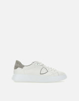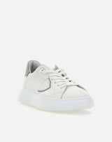 Sneakers uomo Philippe Model Paris "Temple Low", colore bianco, in pelle liscia, spoiler a contrasto in camoscio grigio con piping argentato, fodera interna in spugna di cotone, soletta estraibile in memory foam con tessuto tecnico traspirante, iconico scudo laterale, logo sul retro e sulla linguetta, lacci in cotone piatti, suola in gomma ultra leggera 4cm. Calzata regolare