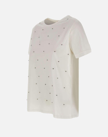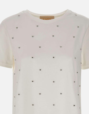 Kaos white cotton short sleeves t-shirt, crew neck, all-over crystal decoration on front, regular fit