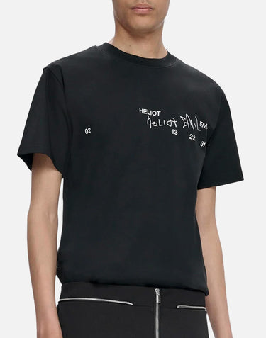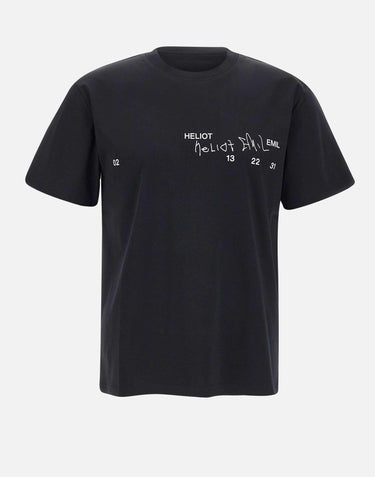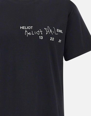 Heliot Emil "Fulgens" men's black cotton t-shirt featuring short sleeves, a round neck, and raglan shoulders. It features a contrasting print on front. Relaxed fit for a casual, contemporary look.