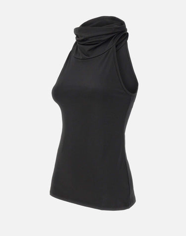 Victoria Beckham "Fluid Drape" top in black jersey, featuring a sophisticated draped neckline that frames the silhouette. Sleeveless design with a slim fit for a sleek, minimal look.