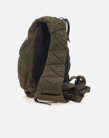 "Backpack Nylon b" C.P. Company, ivy green, satin multifilament Nylon B, garment dyed with anti-drop treatment, adjustable shoulder strap and buckle, external zip pockets, pocket with iconic Lens, internal pocket, woven laces on front, dimensions: 33x22x8