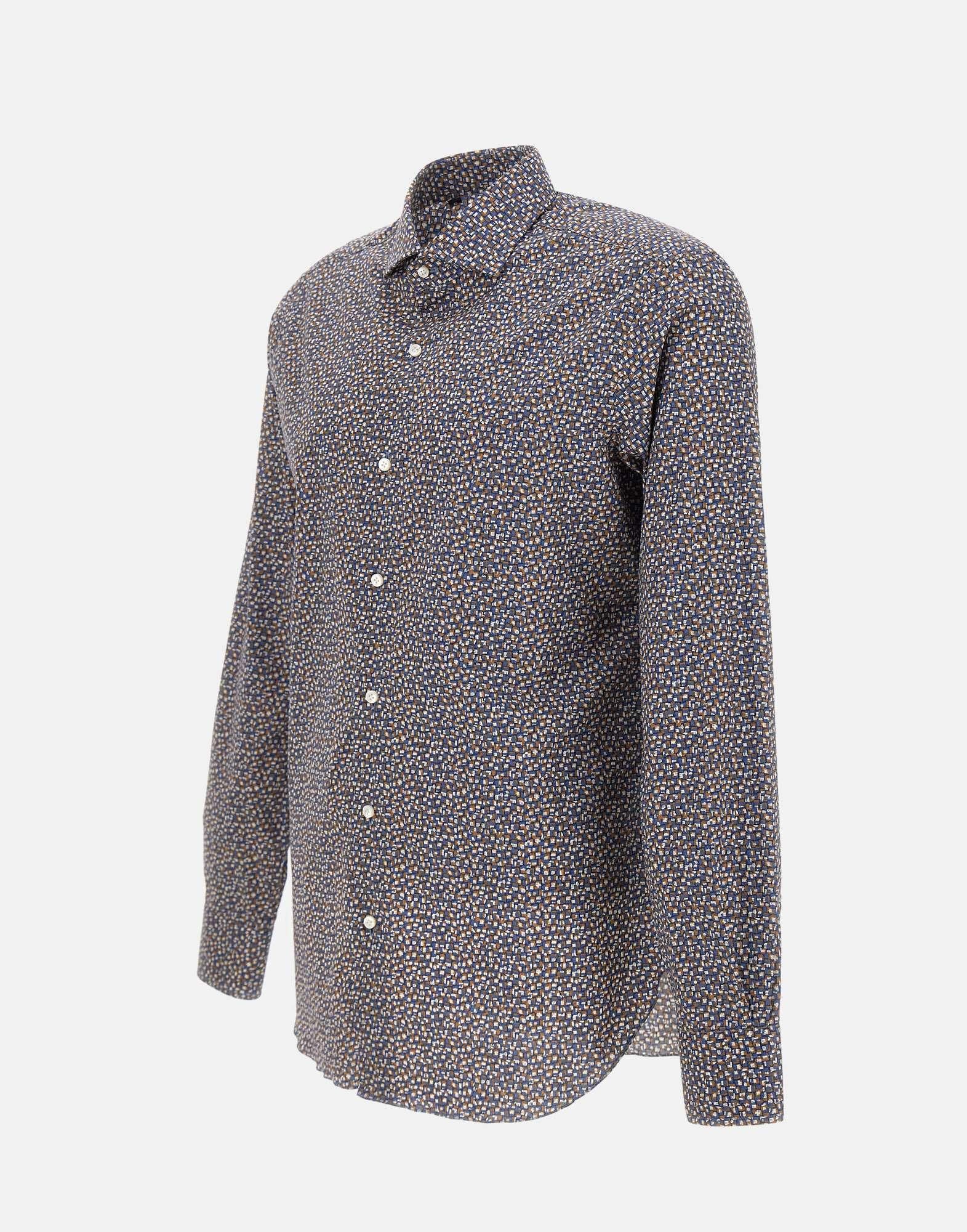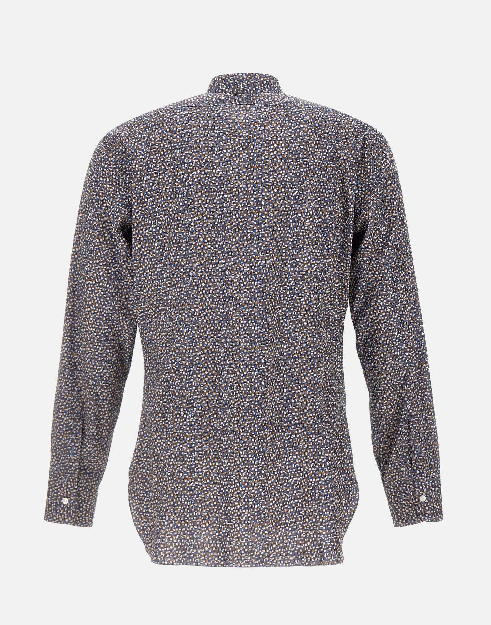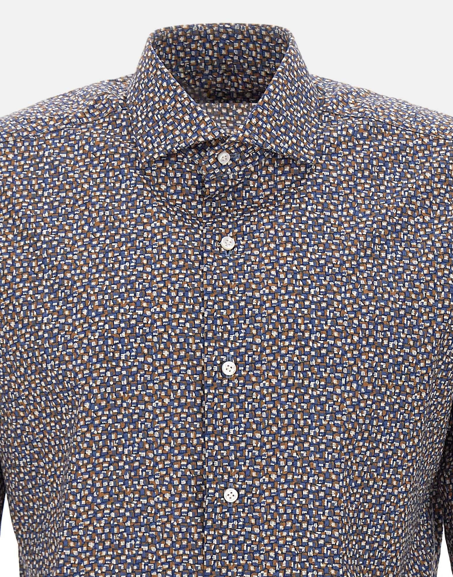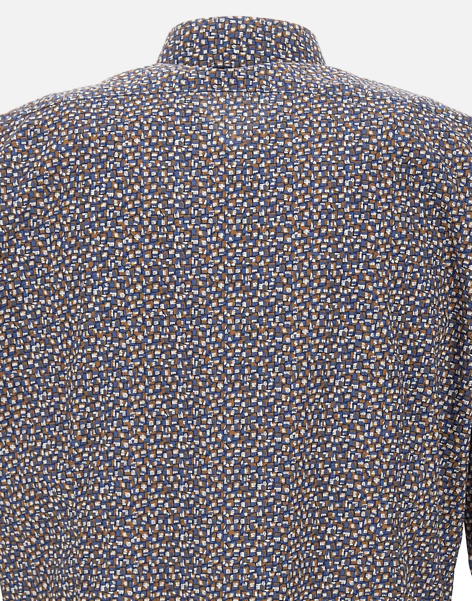 Barba men's shirt stretch cotton blend, featuring a multicolored micro-optical pattern shades of blue, brown and white. It features long sleeves, a classic collar, cuffs with dual-use buttons, a front closure with mother-of-pearl buttons, a rounded hem with side vents, and mini logo labels. Slim fit. Made in Italy, it combines refined tailoring and contemporary style.