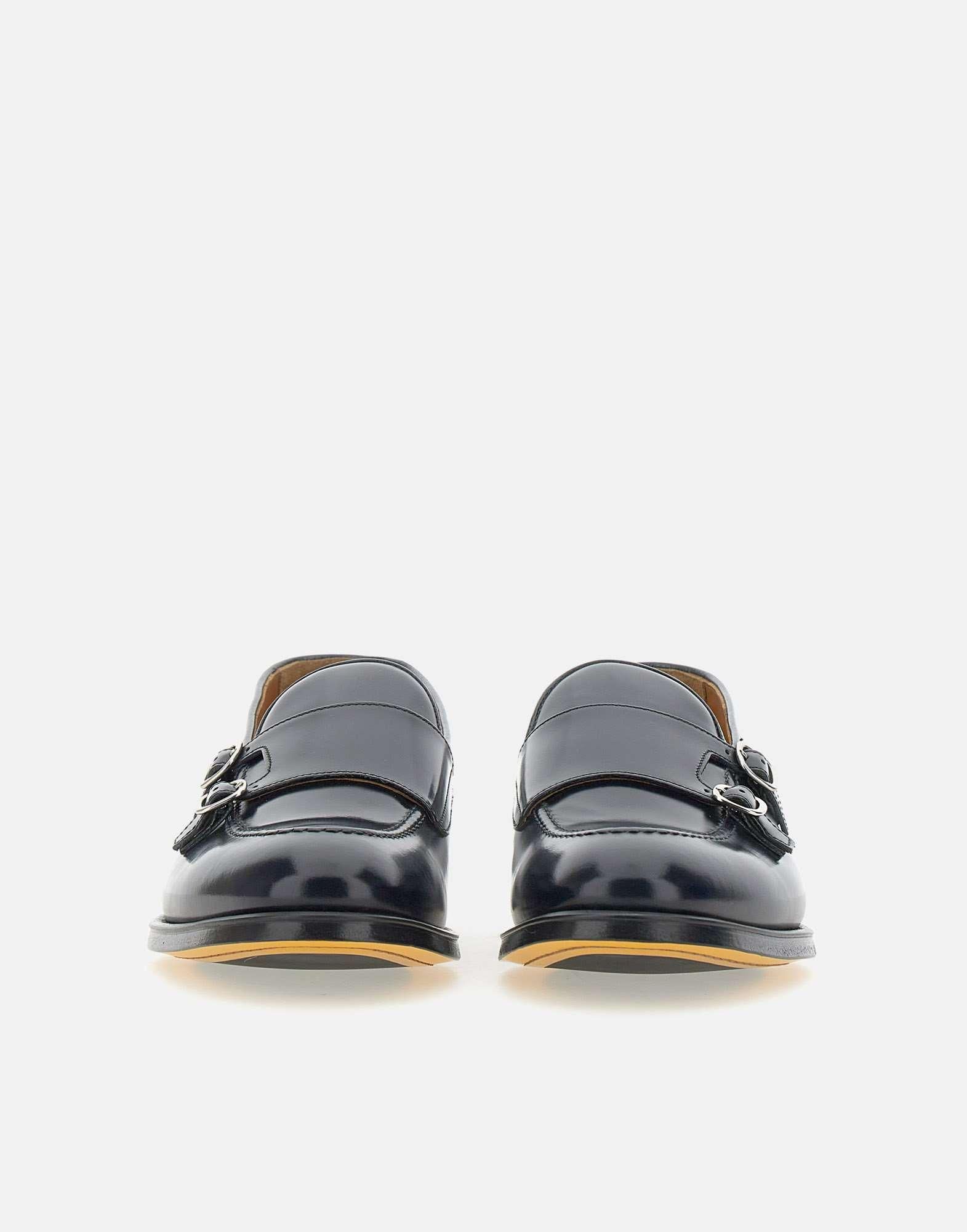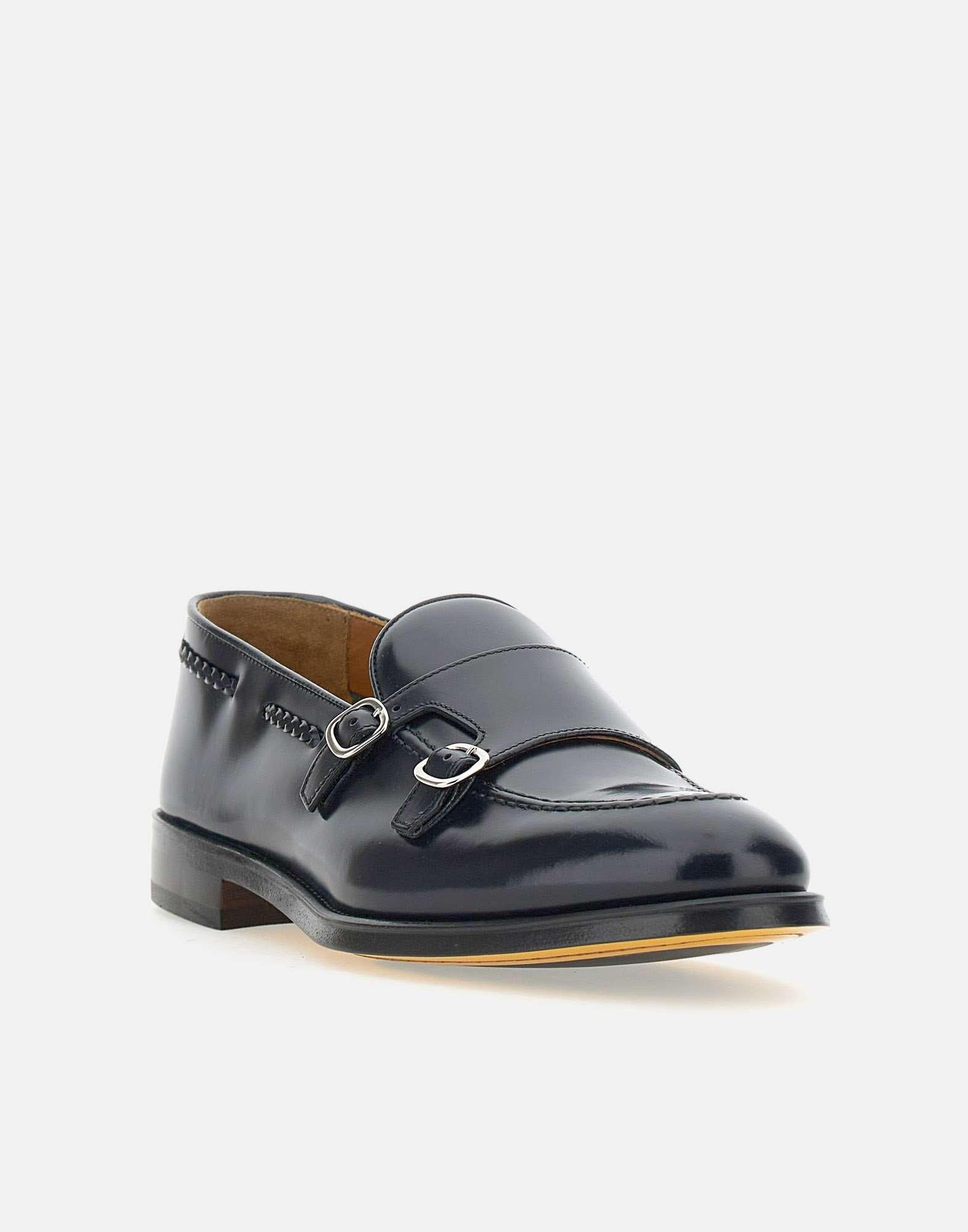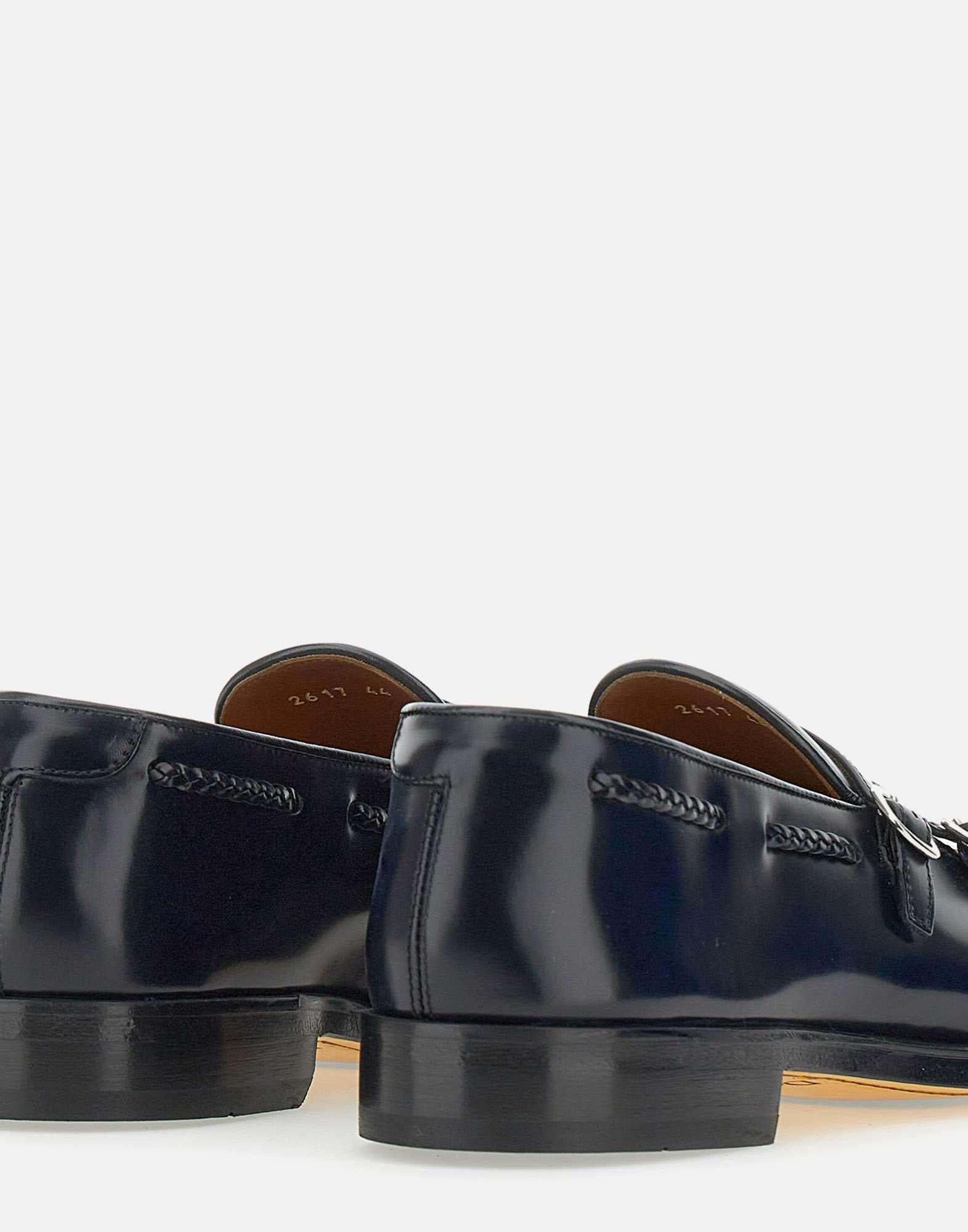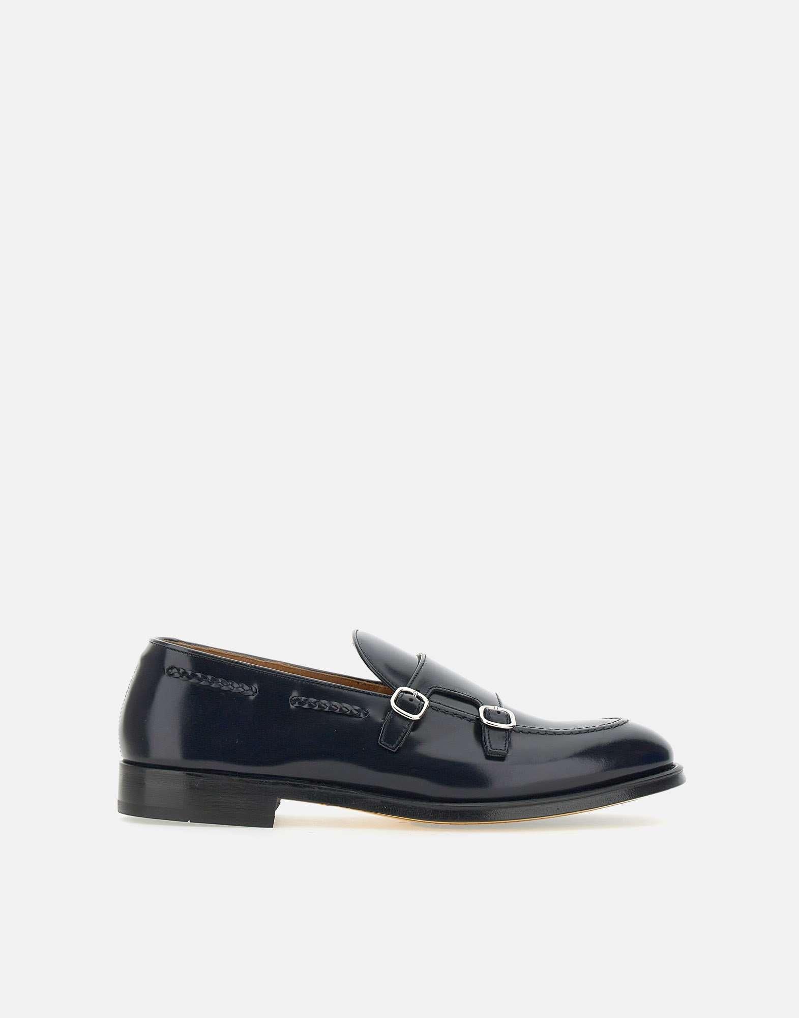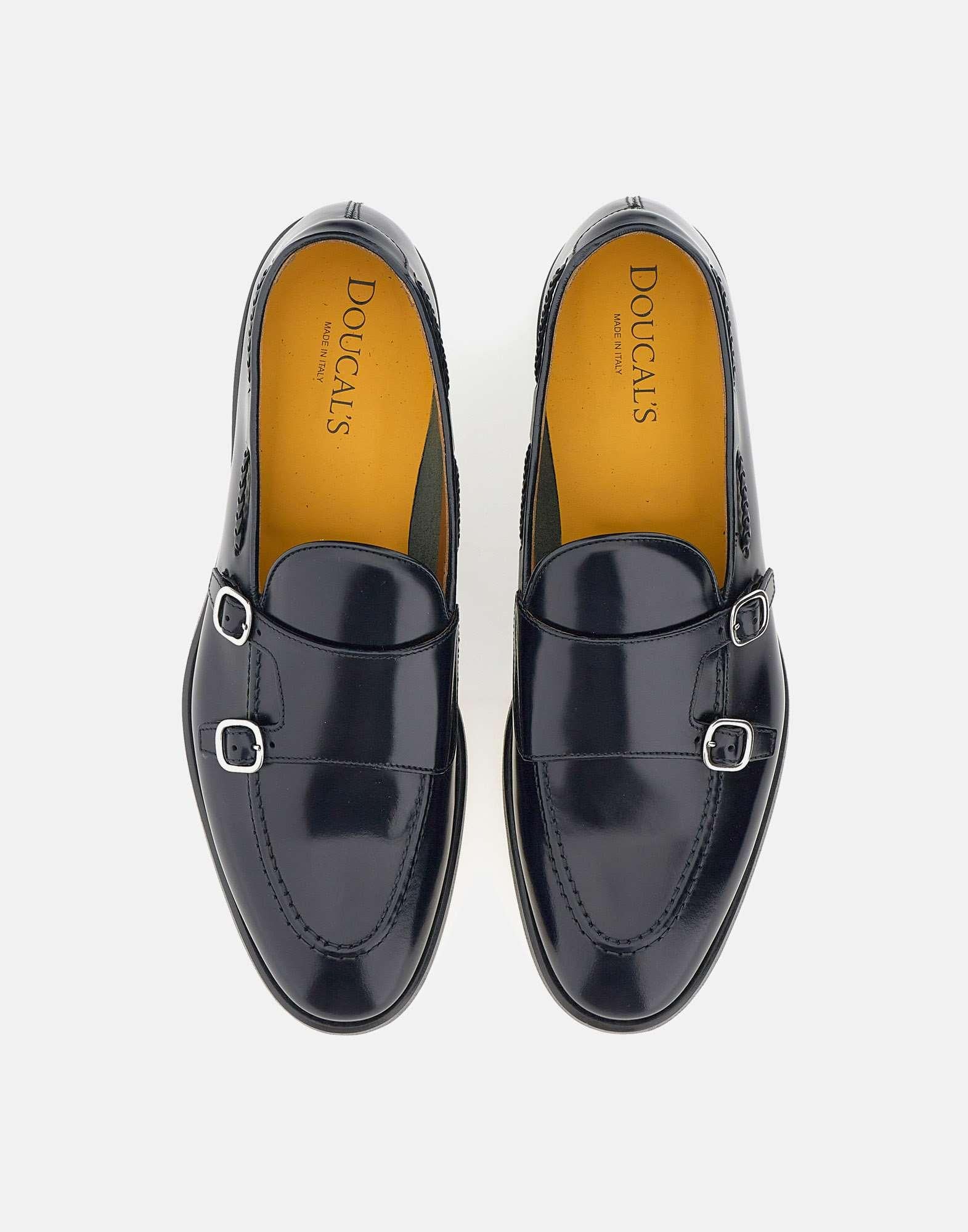 Doucal's smooth leather moccasins, storm-black blue, upper badge with shiny silver double buckle, handcrafted exposed stitching with braid motif, logoed leather insole, leather sole, 2cm rubber heel. Made in Italy. Regular fit, fabric pouch included.