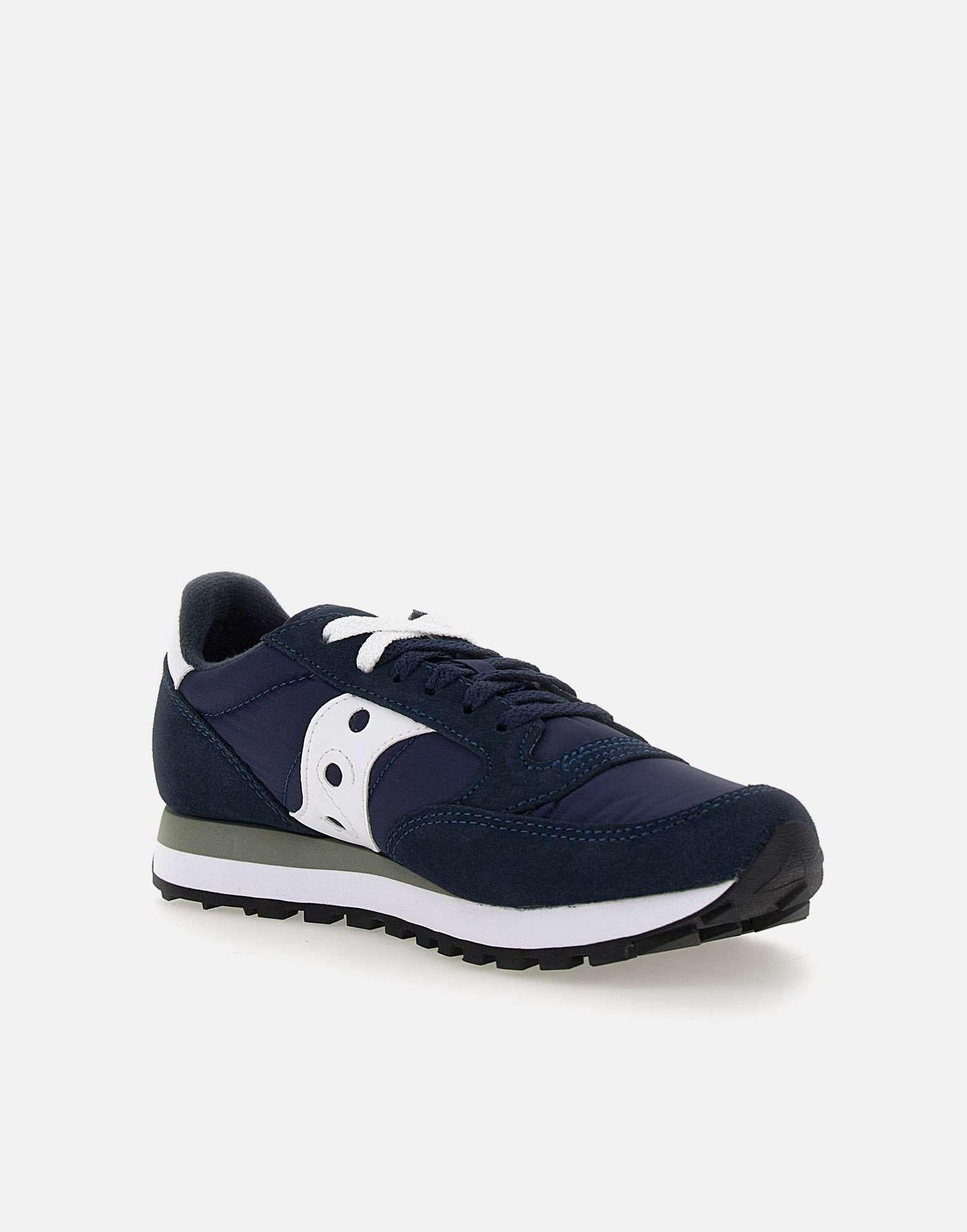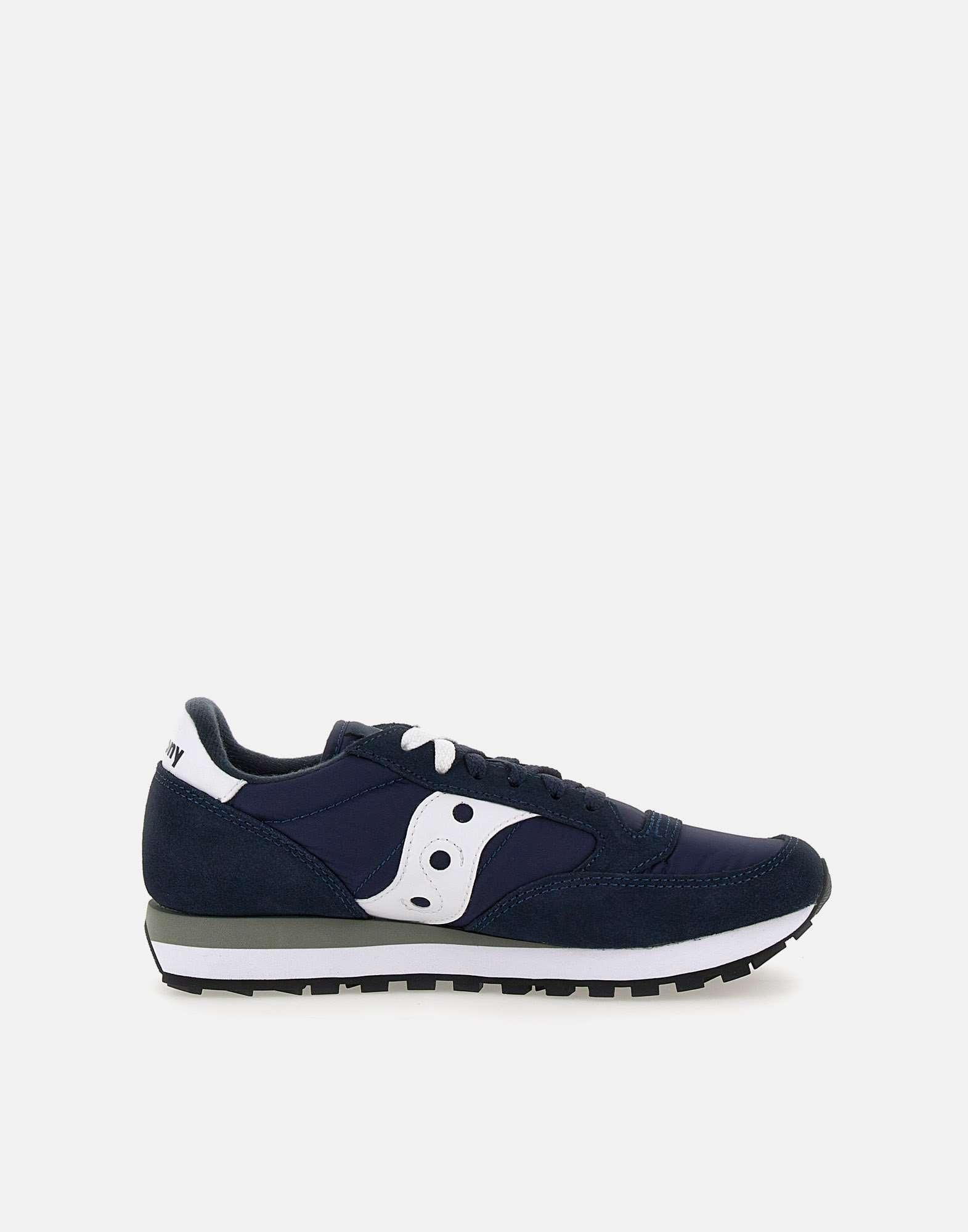 Saucony "Jazz Original" suede and nylon sneakers, blue with white details, two-tone laces, logo on tongue, white logoed heel tab, white side bands, two-tone serrated rubber sole 2.5cm high.