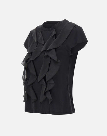 Kaos women's cotton t-shirt, black color, short sleeves, crew neck, ruffle detail on front, regular fit, made in Italy.