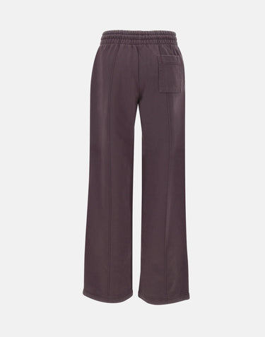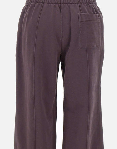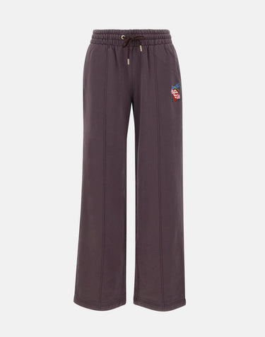 Casablanca "Dragonfly Floral Embroidered Hem" joggers, crafted from loopback cotton jersey with a brushed interior, offered in a refined aubergine hue. The design features an elasticated waistband with drawstring, gold-tone tips and eyelets, side welt pockets, and a back pocket. A central crease and multicolor floral embroidered logo placed on leg add a distinctive touch. Wide leg with 28 cm hem and regular fit ensure both comfort and style.