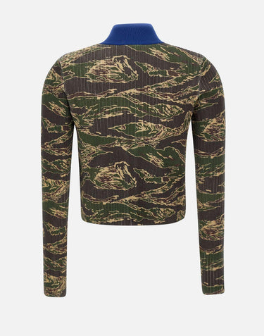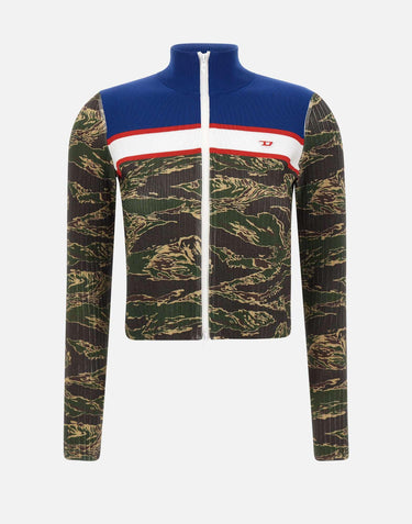 M-camut women's Diesel, multicolor, made of viscose jersey with a percentage of sustainable fibers, stand-up collar, khaki camouflage pattern reinterpreted with contrasting color block insert, ribbed knit, logo patch on chest, long sleeves, full zipper closure, slim fit
