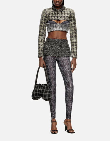 Diesel's "P-Hour Pantaloni" women's leggings are a statement piece from the fall/winter collection, combining the sartorial elegance of tweed with the bold energy of streetwear. The design features a structured tweed miniskirt with a zip and hook closure at the back, layered over tight leggings in a matching stretch fabric, featuring the same pattern for a cohesive, graphic layering effect.