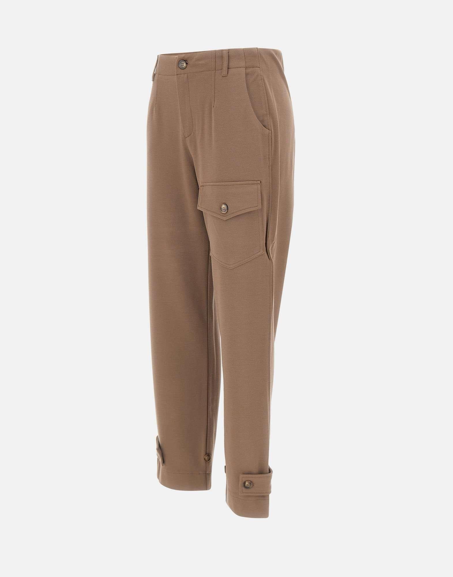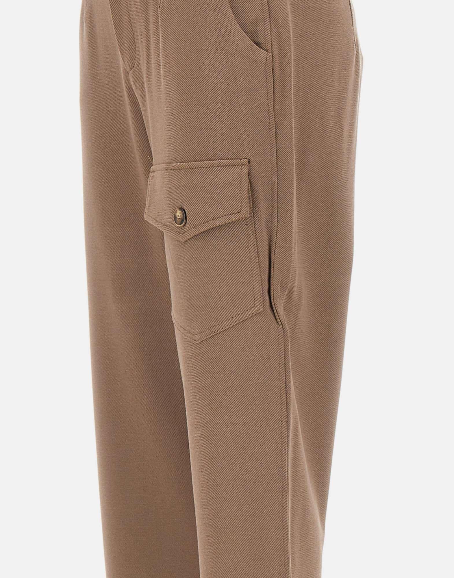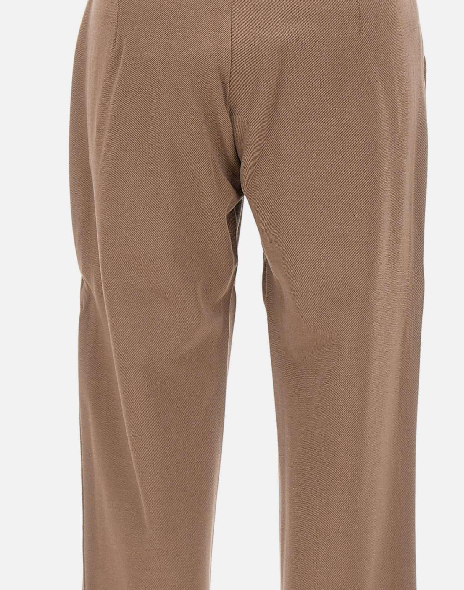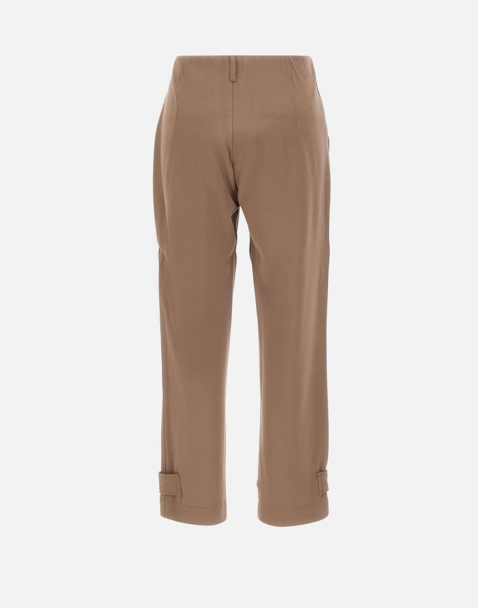 Elena Mirò trousers in biscuit stretch viscose blend with a tailored cut and versatile design. Elasticated waist for added comfort, front zip and button fastening, French pockets and 17 cm hem with buttoned strap detail. Regular fit, ideal for office or smart-casual outfits.