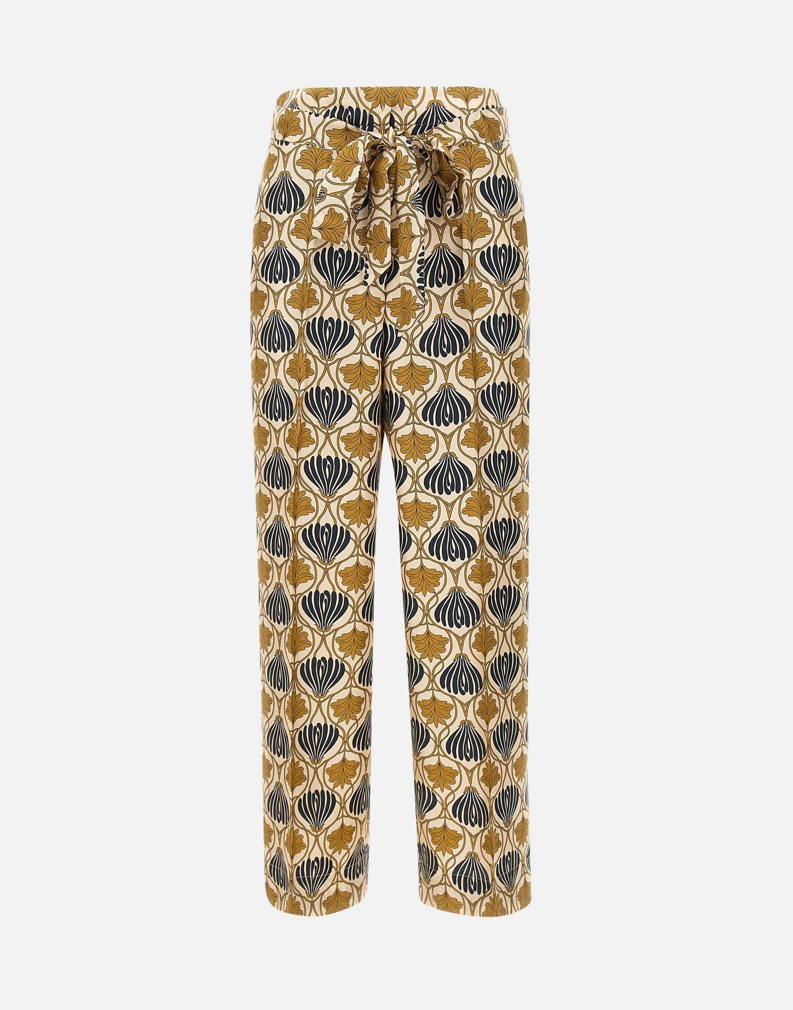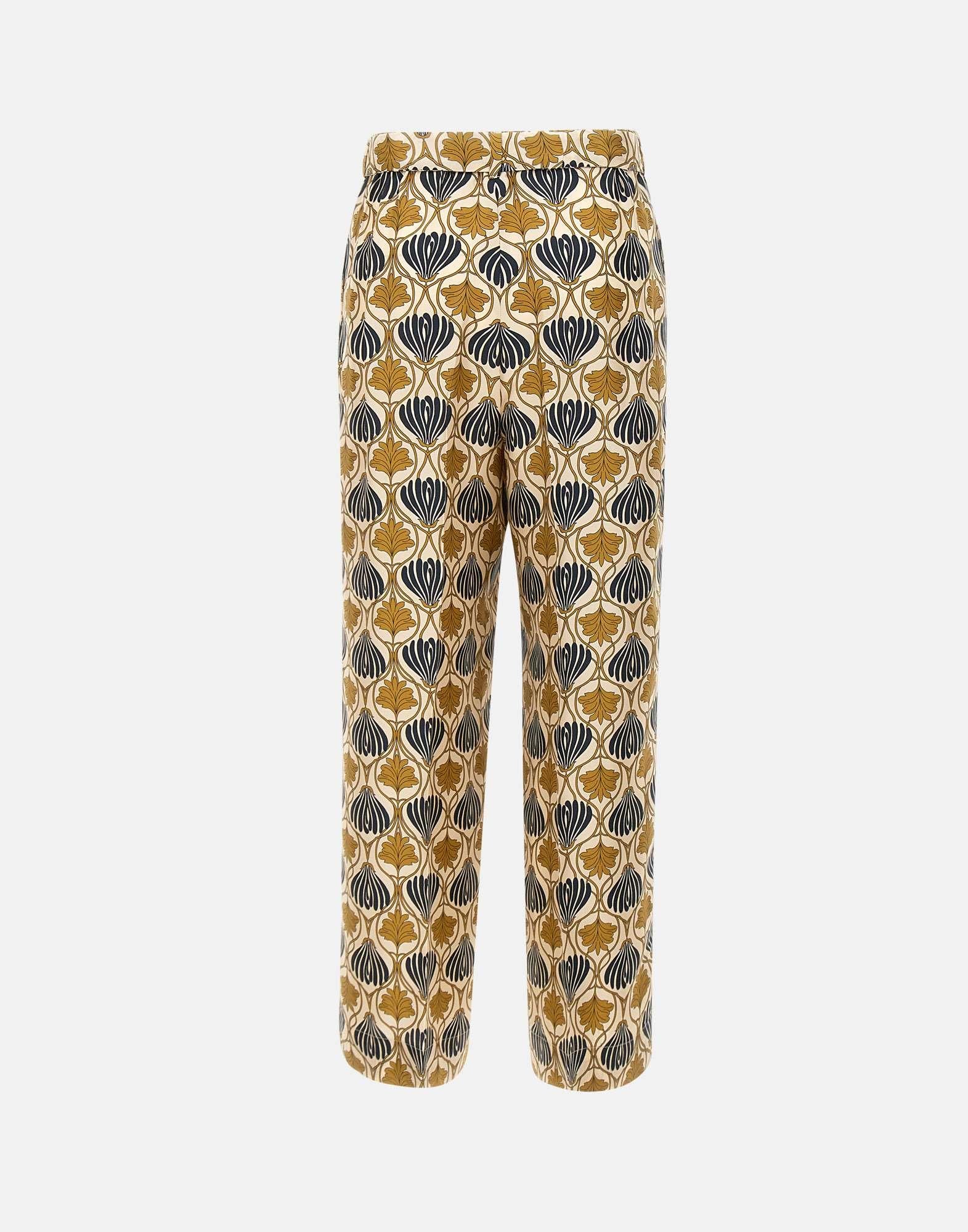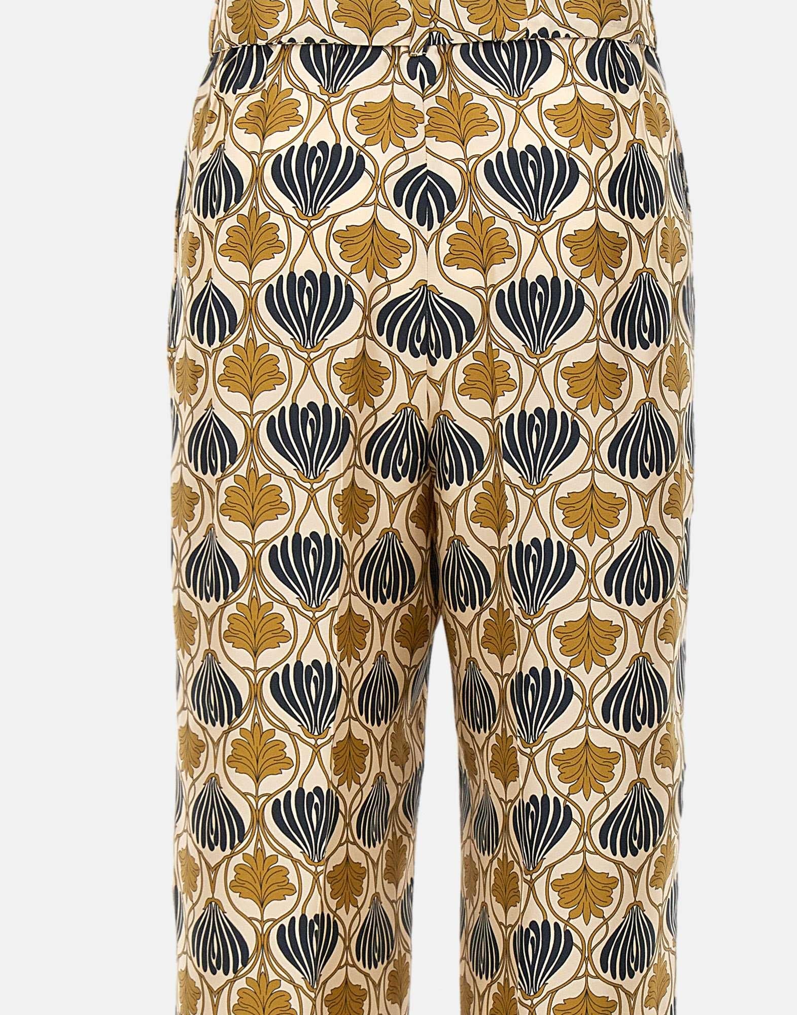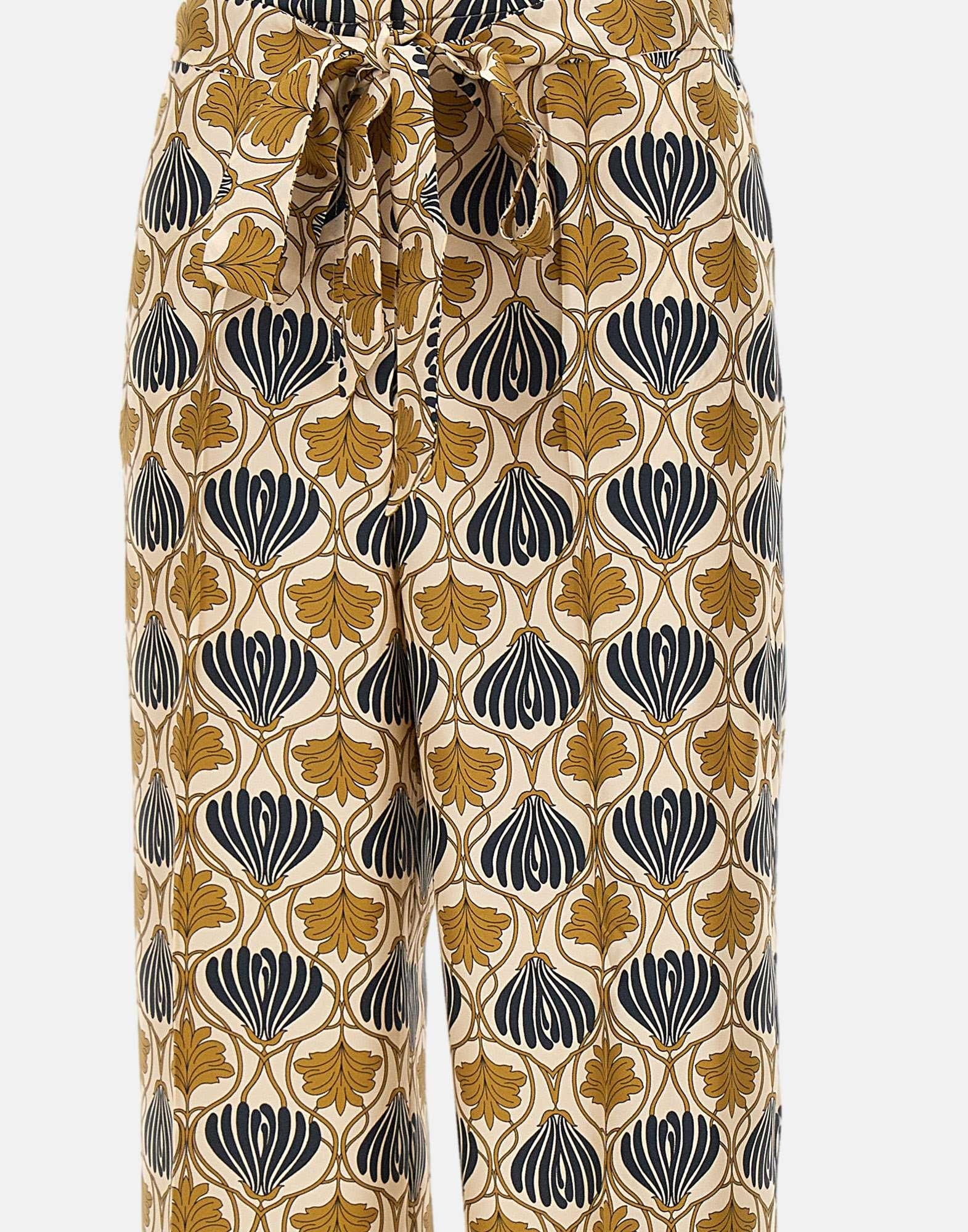 'S Max Mara Timeless "Timec" trousers, multicolor with a prevalence of ivory, blue and gold, pure silk twill, fluid, elasticated waist on back, high waistband fastening, zip with flap and hook, welt pockets on sides, ironed crease on leg, matching belt to tie at waist, 28cm hem, regular fit